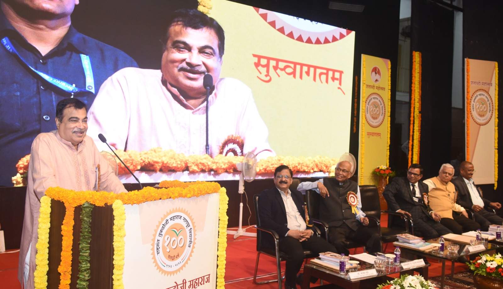 राष्ट्रसंत तुकडोजी महाराज नागपूर विद्यापीठाच्या शताब्दी महोत्सवाची सांगता ना. श्री. गडकरी यांच्या प्रमुख उपस्थितीत झाली. सिव्हिल लाईन्स येथील स्व. डॉ. वसंतराव देशपांडे सभागृहात हा महोत्सव आयोजित करण्यात आला. यावेळी पद्मविभुषण डॉ. रघुनाथ माशेलकर, विद्यापीठाचे प्रभारी कुलगुरू डॉ. प्रशांत बोकारे, प्र-कुलगुरू डॉ. संजय दुधे, राष्ट्रसंत तुकडोजी महाराज जीवनसाधना पुरस्काराने सन्मानित डॉ. सी. डी. मायी यांची प्रमुख उपस्थिती होती.