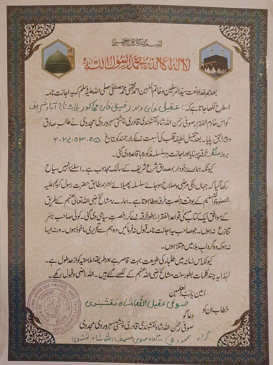 त्यातील एक नामे अखिल खान पठाण ताजबाग निवासी यांना सुद्धा ५ मार्च २०२४ रोजी खिलाफत नामा दिला होता. यांच्या कडून हा दिनांक ८ ऑक्टोंबर २०२४ रोजी सर्व मानवाईक भक्तगणांसमोर हा खिलाफत नामा परत घेण्यात आला. अखिल खान पठाण यांनी कुठल्याही दबावाखाली न येता स्वखुशीने हजरत सुफी अब्दुल रहमान अली शाह नक्शबंदी साहेब यांच्या हातात दिला. खिलाफत नामा ची झेरॉक्स प्रत काढून जादूटोण्याच्या नावावर लोकांची दिशाभूल केली जात आहे. असे निदर्शनास आल्यास हा खिलाफत नामा परत घेण्यात आला.