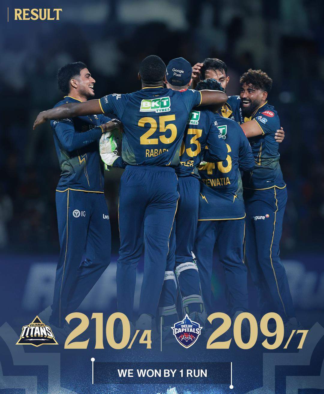 गुजरात टाइटन्स की तरफ से मिले 211 रनों के लक्ष्य का पीछा करते हुए दिल्ली कैपिटल्स बेहद रोमांचक मुकाबले में हार गई है। गुजरात ने इस सीजन की पहली जीत मात्र 1 रन से दर्ज की है। 211 रनों के लक्ष्य का पीछा करते हुए दिल्ली कैपिटल्स के बल्लेबाज केएल राहुल ने सबसे अधिक 92 रन बनाए। उनके अलावा डेविड मिलर ने 41 नाबाद और पथुम निसांका ने 41 रनों की पारी खेली।