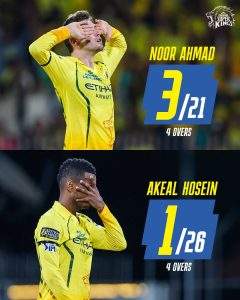 चेन्नई के लिए नूर अहमद ने चार ओवरों में तीन रन देकर तीन विकेट लिए। कंबोज ने दो विकेट लिए। खलील और अकील के हिस्से एक-एक विकेट आया।