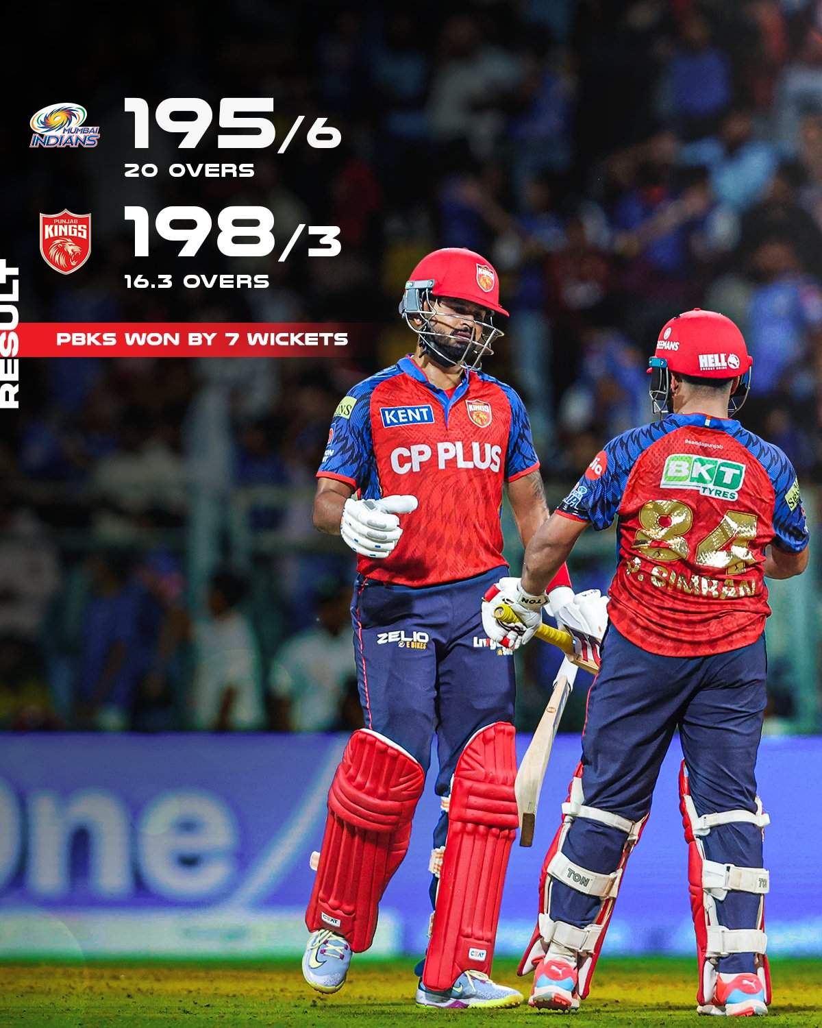 अर्धशतक लगाने के बाद मैच जल्दी खत्म करने के प्रयास में कप्तान अय्यर ने नमन धीर को कैच थमा दिया। उन्होंने 35 गेंदों पर 66 रन की पारी खेली। अपनी इस पारी में अय्यर ने 5 चौके और 4 छक्के भी लगाए। प्रभसिमरन सिंह ने 39 गेंदों पर नाबाद 80 रन बनाए। मार्कस स्टोइनिस ने 5 गेंदों का सामना किया और 10* रन बनाए।