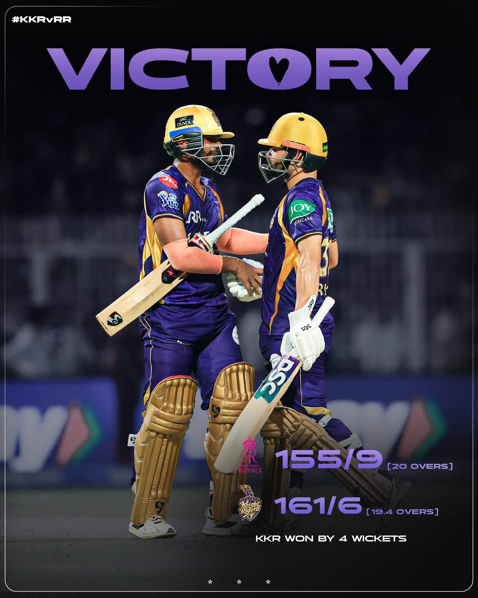 राजस्थान रॉयल्स (RR) ने मैच में पहले बल्लेबाजी करते हुए 9 विकेट के विकेट के नुकसान पर 155 रन बनाए थे। 156 रनों के लक्ष्य का पीछा करते हुए केकेआर ने इसे 19.4 ओवरों में 6 विकेट के नुकसान पर हासिल कर लिया और 4 विकेट से जीत दर्ज की। रिंकू सिंह ने 34 गेंदों पर नाबाद 53 रनों की पारी खेली। तो वहीं अनुकूल 16 गेंदों पर 29 रन बनाकर नाबाद रहे। इसी के साथ कोलकाता ने सीजन की पहली जीत हासिल की है।