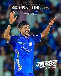 जवाब में गुजरात की टीम 15.4 ओवर में 100 रन पर ढेर हो गई। मुंबई ने 99 रन से यह मुकाबला जीता। यह मौजूदा सीजन की सबसे बड़ी जीत है। 4 हार के बाद मुंबई को जीत मिली है। इससे पहले उन्होंने इस सीजन का पहला मैच जीता था।