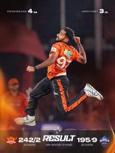 अभिषेक ने अपने आईपीएल करियर का कुल दूसरा और टी20 करियर का नौवां शतक जमाया। उन्होंने 68 गेंदों पर 10 चौके और 10 छक्कों की मदद से नाबाद 135 रनों की पारी खेली। अंत में हेनरिक क्लासेन ने 13 गेंदों पर तीन चौके और तीन छक्कों की मदद से नाबाद 37 रन बनाए। मलिंगा ने चार ओवरों में 32 रन देकर चार विकेट लिए। इस जीतने हैदराबाद को तीसरे स्थान पर पहुंचा दिया है। उसके सात मैचों में चार जीत और तीन हार के बाद आठ अंक हो गए हैं।