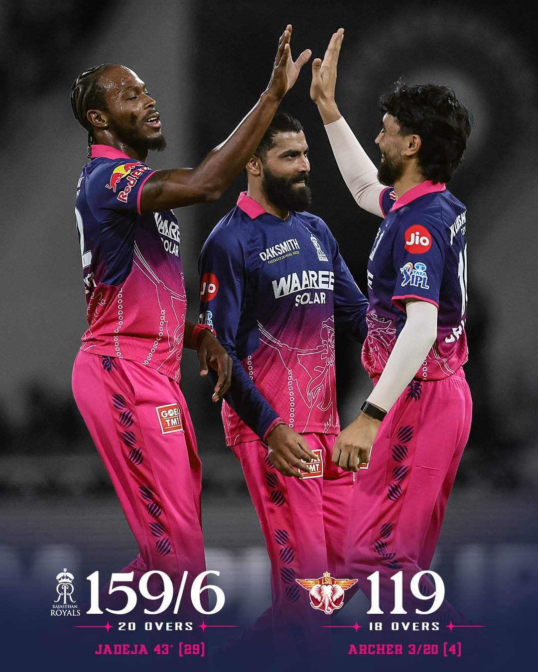 रियान पराग की कप्तानी वाली राजस्थान ने मैच में पहले बल्लेबाजी करते हुए 6 विकेट के नुकसान पर 159 रन बनाए थे। इसके जवाब में लखनऊ के शुरुआती तीन बल्लेबाज अपना खाता भी नहीं खोल सके और जीरो पर आउट हो गए। लखनऊ 119 रनों पर सिमट गई और उन्हें 40 रनों से हार का सामना करना पड़ा।