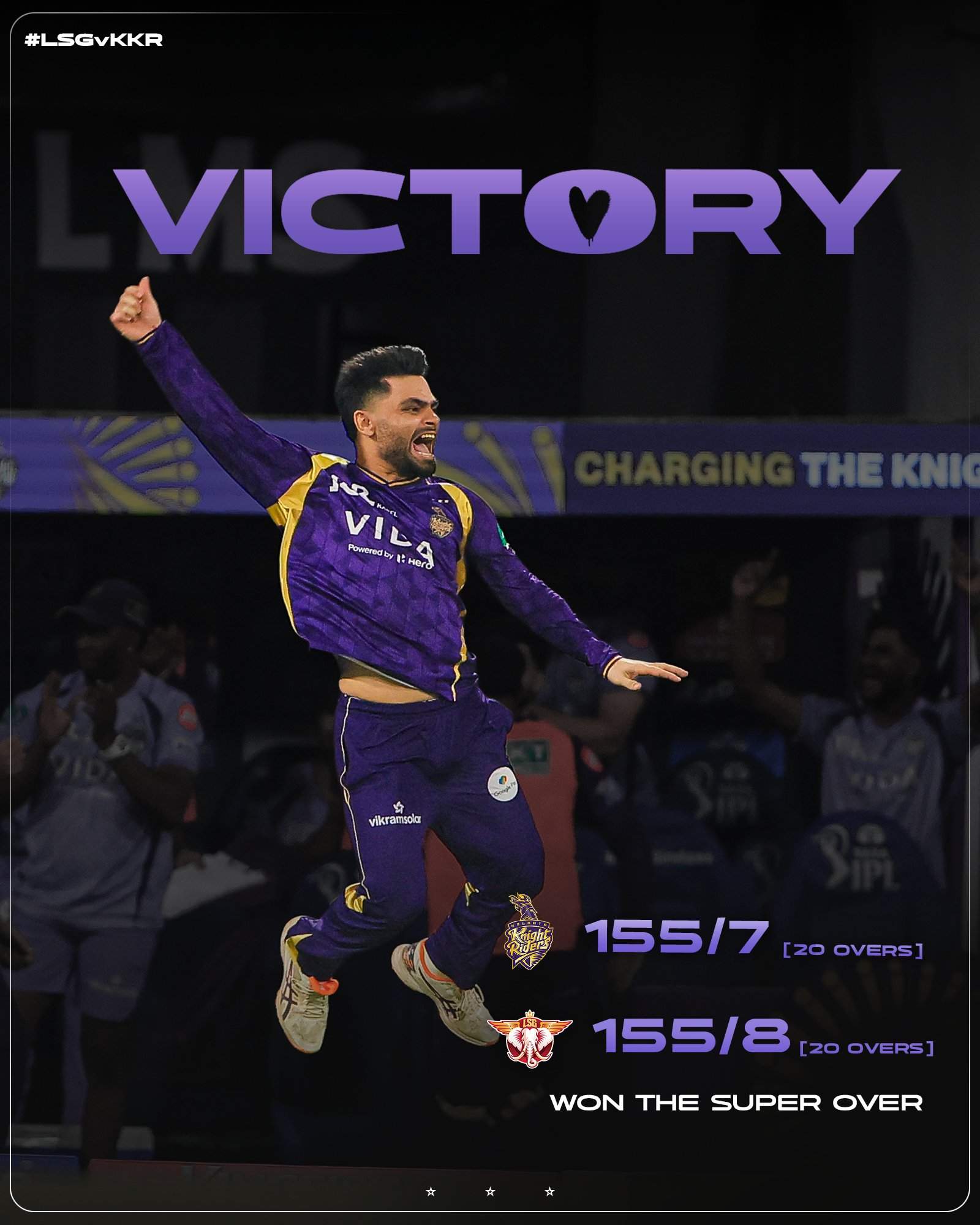 कोलकाता को सुपर ओवर में जीत के लिए 2 रनों की जरूरत थी। लखनऊ की तरफ से तेज गेंदबाज प्रिंस यादव गेंदबाजी करने के लिए आए। कोलकाता के लिए रिंकू सिंह और रोवमैन पॉवेल बैटिंग करने के लिए आए। रिंकू ने पहली ही गेंद पर चौका लगाकर कोलकाता को जीत दिलाई। इसी के साथ केकेआर ने सीजन की दूसरी जीत दर्ज की। उन्होंने प्लेऑफ दी उम्मीदों को भी जिंदा रखा है।