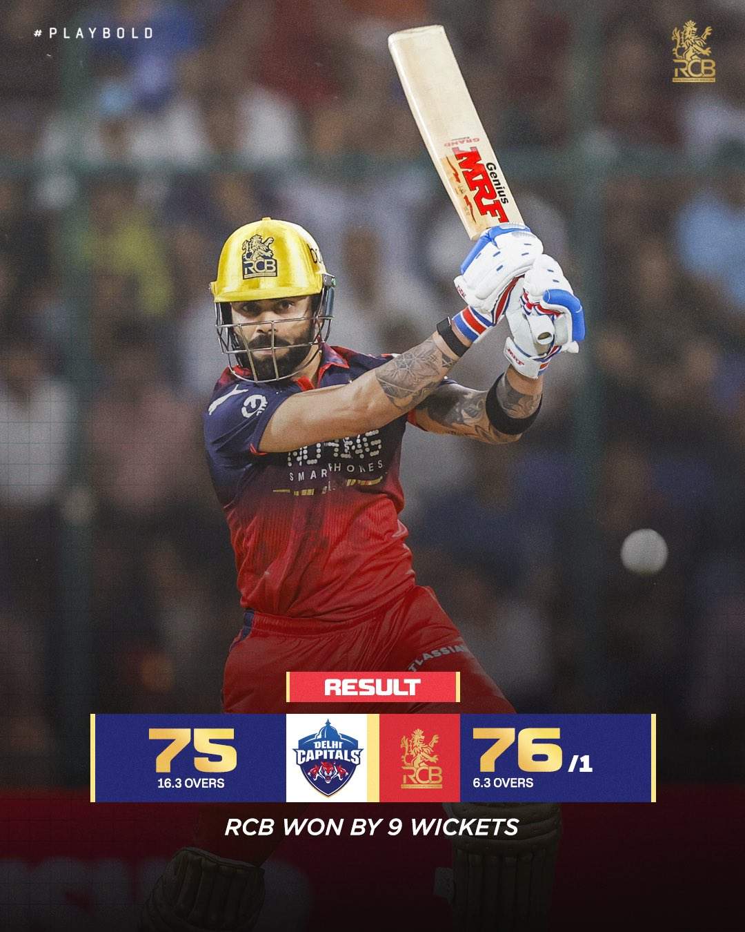 इस आसान से टारगेट को आरसीबी ने 7.2 ओवरों में एक विकेट खोकर नौ विकेट से जीत हासिल कर लिया। एक समय तो दिल्ली का 50 रनों तक पहुंचना मुश्किल लग रहा था, लेकिन अभिषेक पोरेल ने 30 रनों की पारी खेल उसे अपने सबसे कम स्कोर के रिकॉर्ड को तोड़ने से बचा लिया।